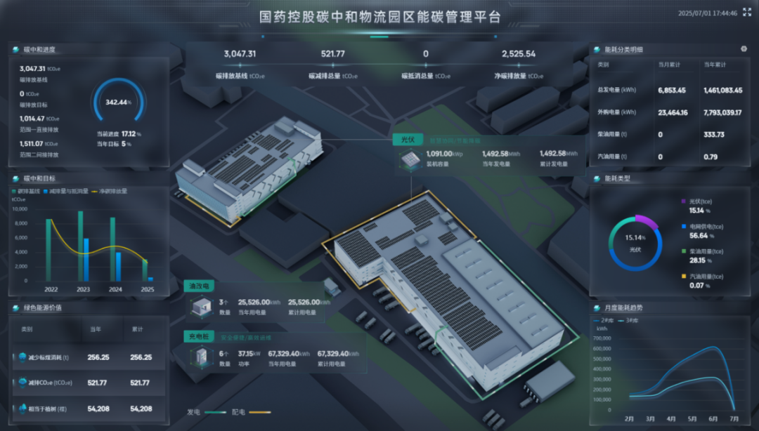 园区采用数字化与零碳化运营,通过国药控股能碳管理平台和智能计量系统连接核心设备,如同园区的“绿色神经中枢”,实时精准采集能耗数据,并利用权威碳排放因子库及核算模型,实现能耗管控与碳排放精准核算。平台集能碳管理、光伏监测、绿电交易、碳管理看板等多项功能于一体,直观展示国药物流园区各环节能耗与碳足迹,实现可追溯管理,为持续优化、精准降碳提供了强有力的数据支撑和科学指导。